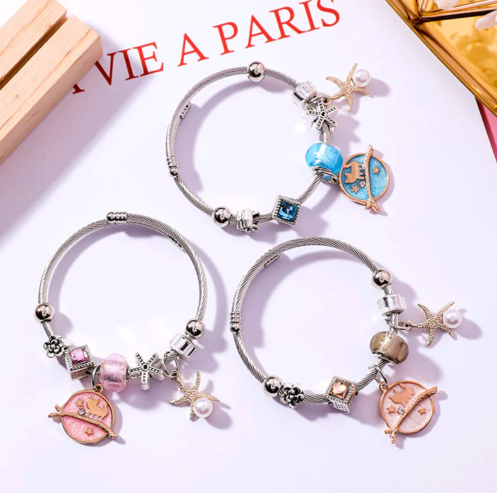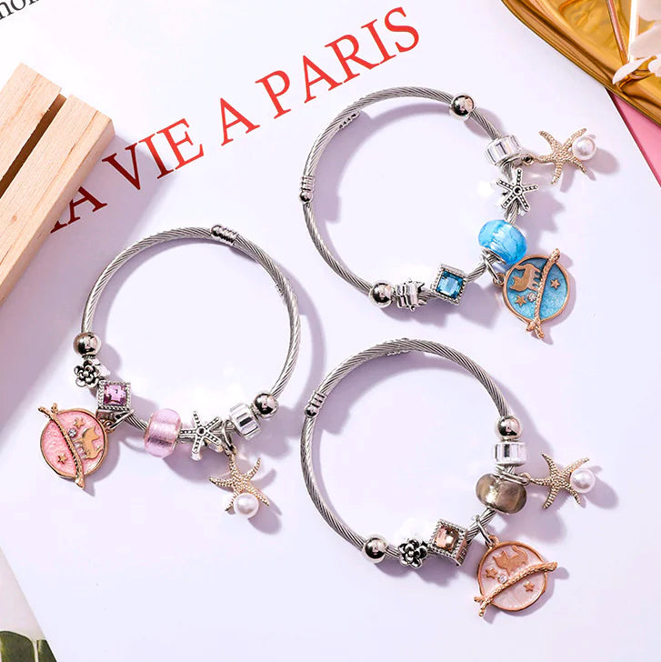 This unique piece features charming cat and starfish designs, beautifully accented with crystals that capture the light and elevate your style. Crafted from high-quality titanium steel, this bracelet is not only durable but also lightweight, making it a comfortable accessory for everyday wear. The electroplating process ensures a lasting shine, while the simple yet fashionable style makes it ideal for commuting or any casual outing. Choose from three vibrant colors: